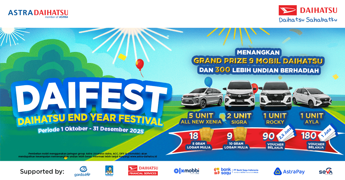 - Untuk pemesanan kendaraan Daihatsu dengan status kendaraan masih dalam proses produksi dan/atau pemesanan di Agen Tunggal Pemegang Merek (inden), maka harga sewaktu–waktu dapat berubah menyesuaikan harga On The Road terbaru saat unit kendaraan bermotor tersedia.