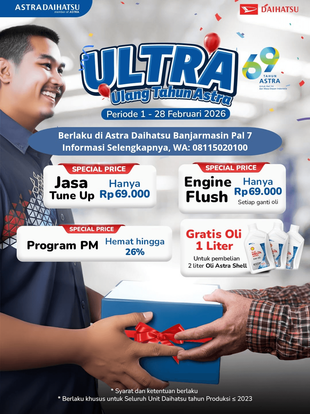 Selamat datang di Astra Daihatsu Banjarmasin. Kami menawarkan beragam mobil Daihatsu terbaru dengan penawaran paling menarik. Tersedia beragam promo maupun fasilitas pembayaran secara kredit dan tunai. Dapatkan juga layanan purna jual dengan fasilitas bengkel terbaik hanya di Astra Daihatsu Banjarmasin.