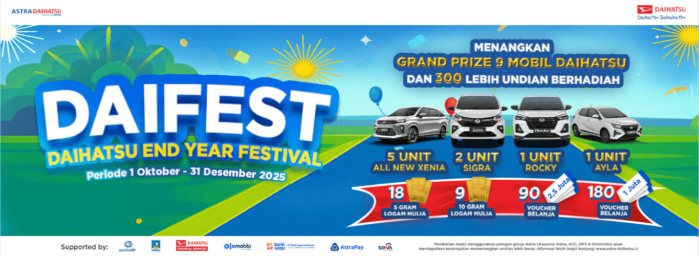 - Untuk pemesanan kendaraan Daihatsu dengan status kendaraan masih dalam proses produksi dan/atau pemesanan di Agen Tunggal Pemegang Merek (inden), maka harga sewaktu–waktu dapat berubah menyesuaikan harga On The Road terbaru saat unit kendaraan bermotor tersedia.