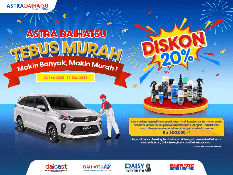 - Untuk pemesanan kendaraan Daihatsu dengan status kendaraan masih dalam proses produksi dan/atau pemesanan di Agen Tunggal Pemegang Merek (inden), maka harga sewaktu–waktu dapat berubah menyesuaikan harga On The Road terbaru saat unit kendaraan bermotor tersedia.