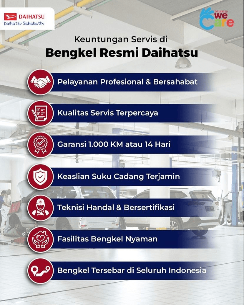 Yuk service mobil Daihatsu kesayanganmu di Bengkel Resmi Daihatsu, karna hanya di bengkel resmi Daihatsu dapat keuntungan, antara lain:
