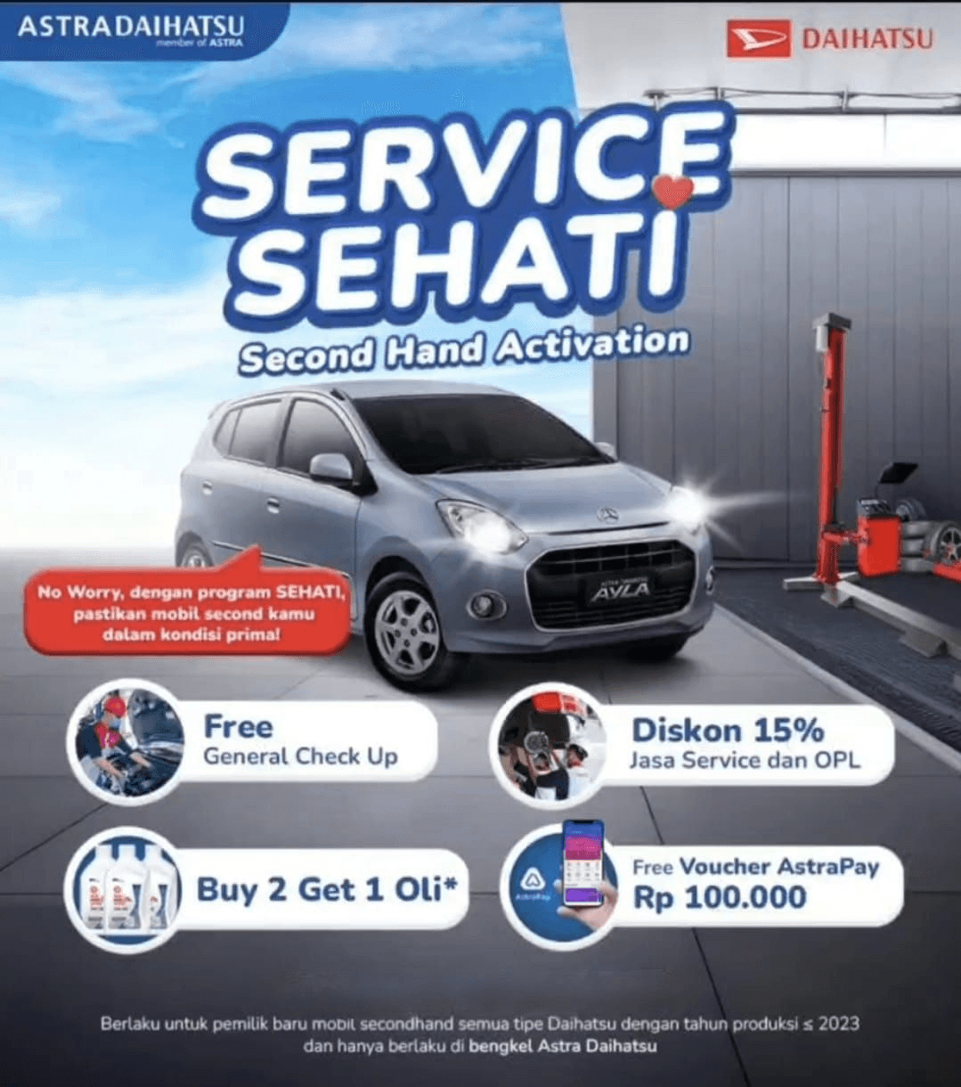 - Dalam hal servis kendaraan bermotor dengan layanan Daihatsu Mobile Service (DMS), maka booking servis wajib dilakukan maksimal 1 (satu) hari sebelum servis hendak dilaksanakan.